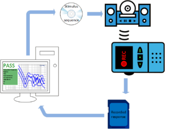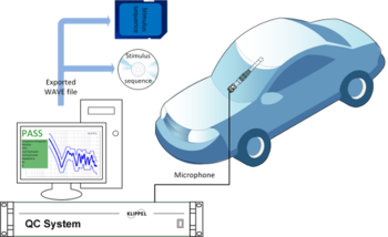 If the device under test (in this example an automobile audio system) does not provide an accessible auxiliary signal input, the stimulus sequence must be transferred off-line to the audio system.