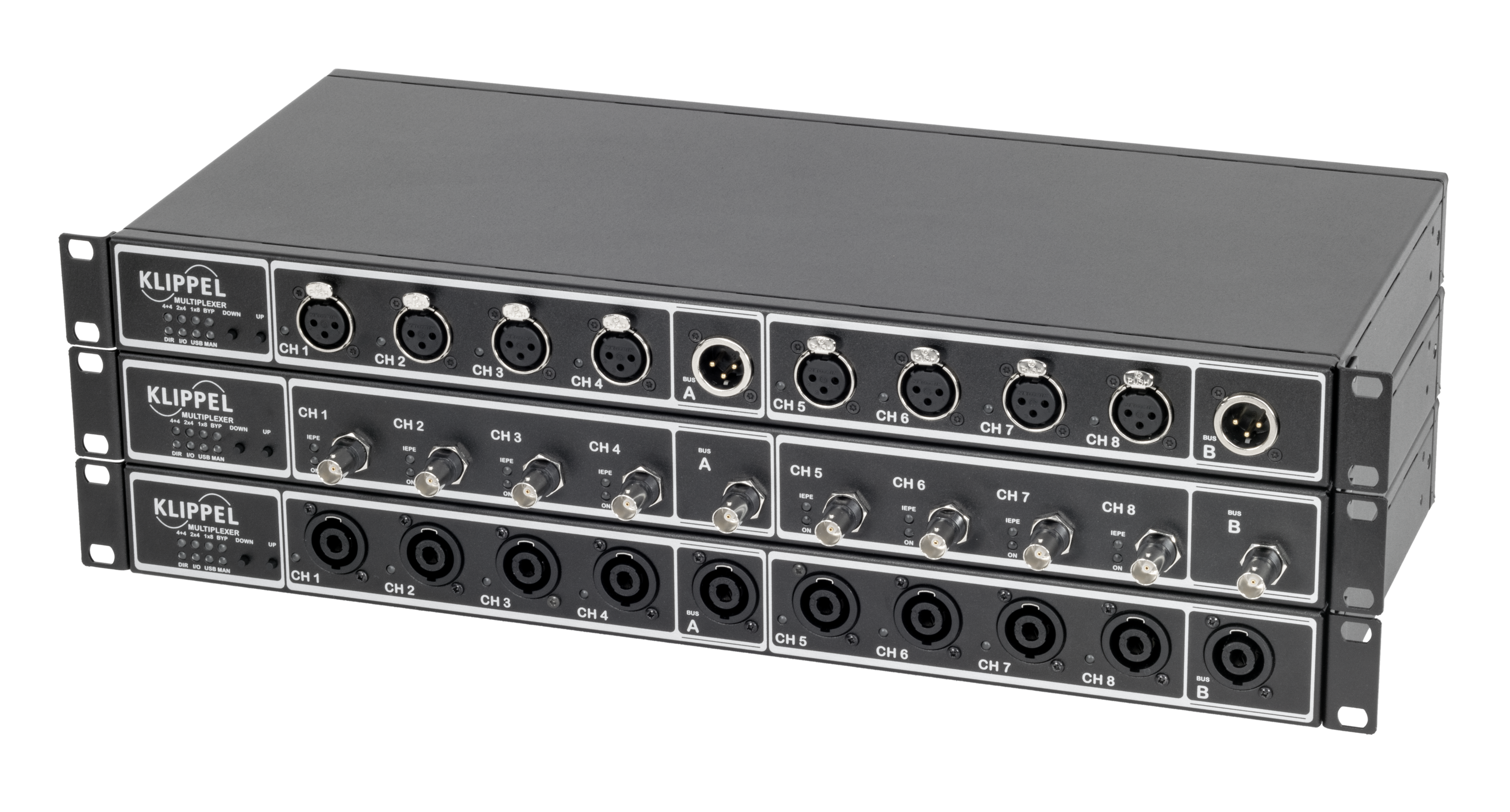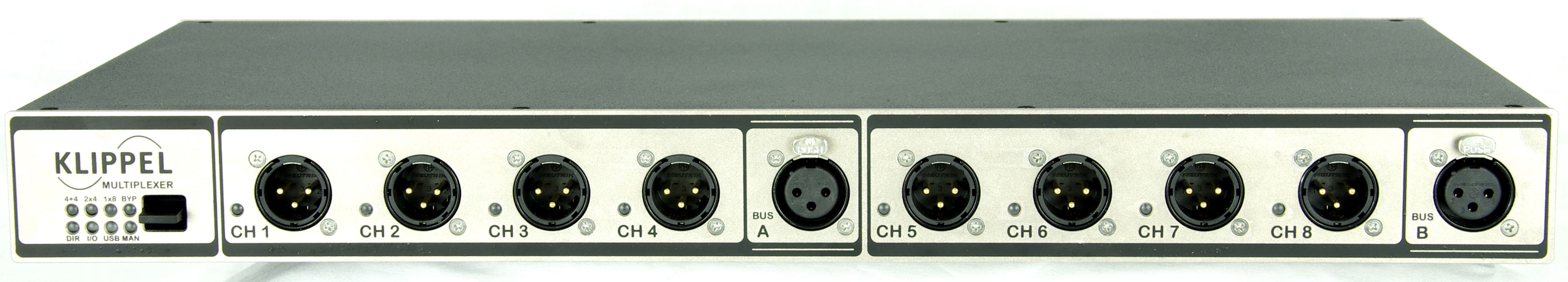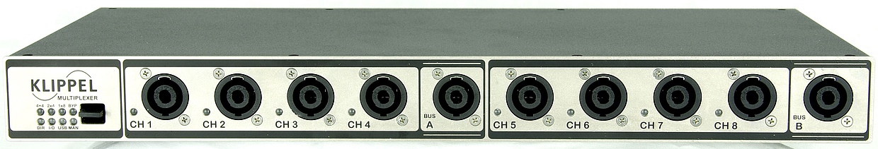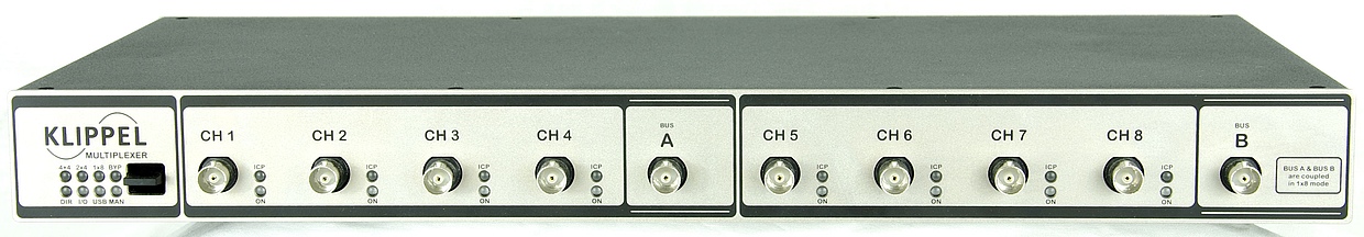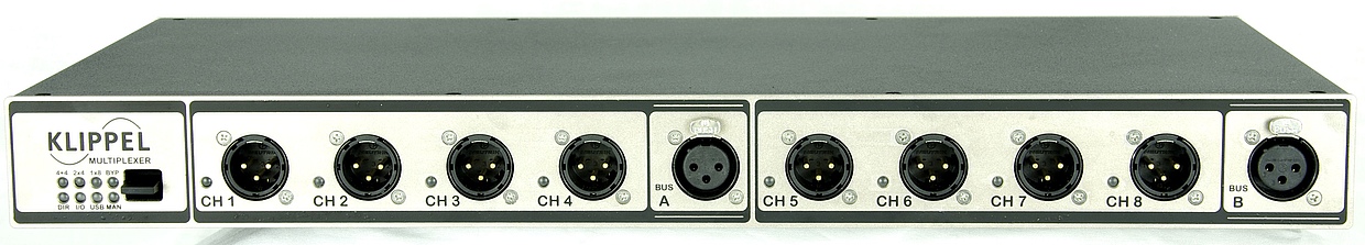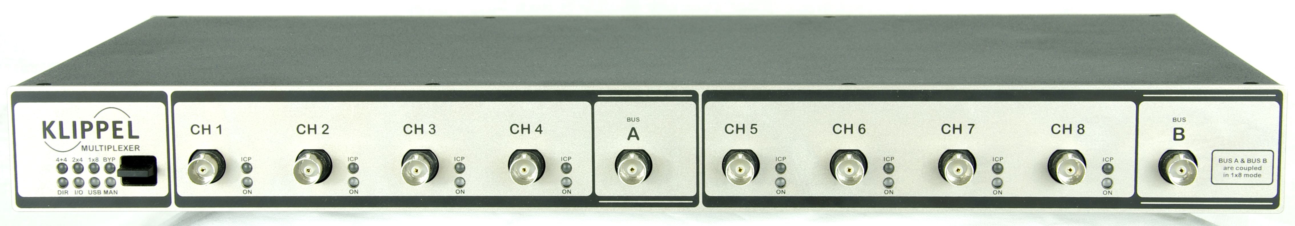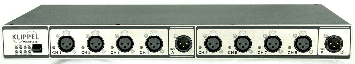 For testing multi-channel systems, a Multiplexer can help to simplify cabling and routing. The KLIPPEL Multiplexer hardware can be directly controlled by the QC SYSTEM. For R&D and all other applications, the routing can be controlled using dB-Lab software or by a USB or parallel port interface software, provided by KLIPPEL. This software can be controlled by the command line of automated applications. KLIPPEL offers very flexible Multiplexer hardware with up to 8 channels. Different routing modes are available to use the Multiplexer for selecting one or more input channels from 8 resources or distribute one or two sources to up to 8 receivers. Several hardware versions with different connectors and electrical parameters are available. Different control ports offer the flexible usage in a lot of applications. The Multiplexer can be controlled manually and by software.