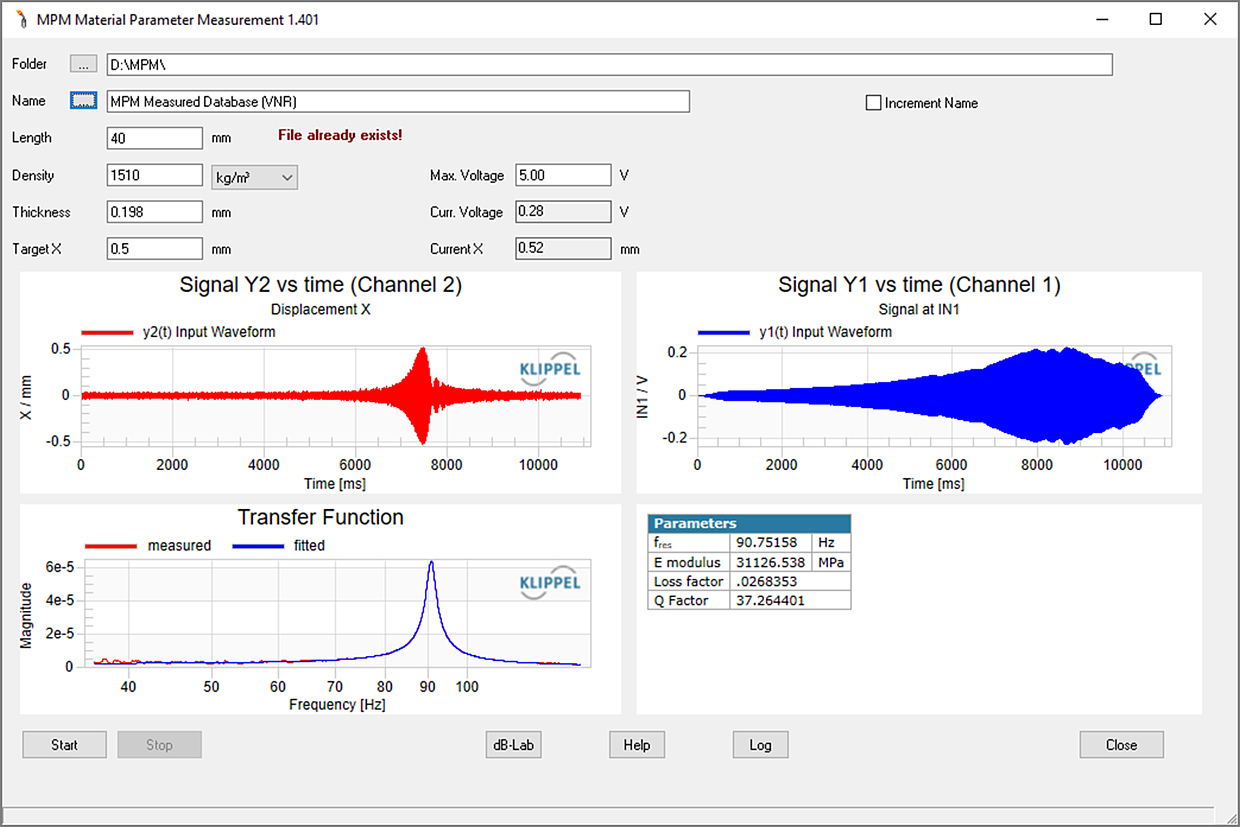 The figure (on the left) shows the user interface of the MPM software for measuring the Young’s (E) modulus and loss factor of material samples. The software automatically adjusts the voltage of the stimulus to generate the desired target value of the maximal displacement (in this example 1 mm). The density of the material, the thickness of the sample and the length of the beam are additional input parameters provided by the user.