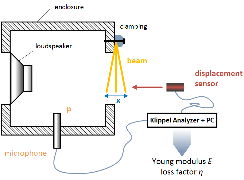 The Material Parameter Measurement Module (MPM) measures the Young’s (E) modulus and the loss factor η of the raw material used for loudspeaker design. The vibration beam technique (ASTM E 756-93) is modified to be capable of measuring also soft materials, such as thin foils of plastic, rubber and any kind of paper and impregnated fabric. After cutting 1cm strips, the probes are clamped on one side and excited pneumatically by using the Suspension Part Measurement bench (SPM bench).