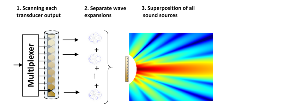 The sound pressure output of loudspeaker systems with multiple transducers (line sources, sound bars, 3-way systems, etc.) can be determined by measuring each transducer separately using a multiplexer. After the holographic processing the sound pressure of the individual source can be superimposed to determine the total sound pressure output of the audio device.