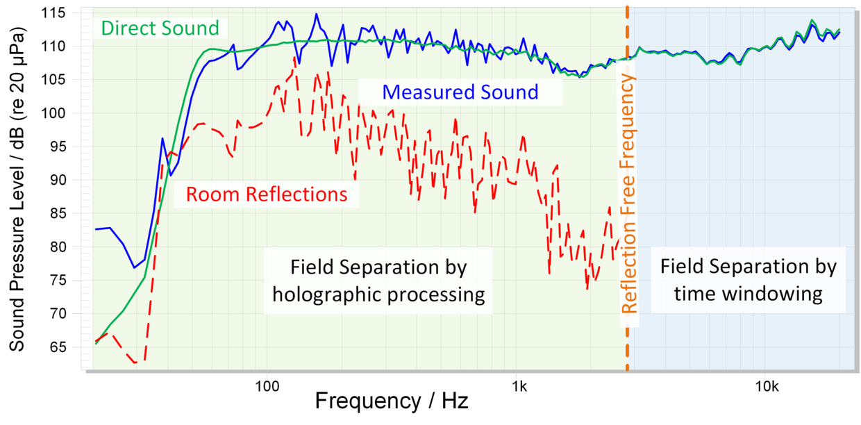 The Direct Sound Separation approach solves this issue, providing a separation of the radiated sound from the reflections and room resonances. This method is useful for low frequencies (below 1 kHz) where windowing techniques cannot be applied. In such frequency bands, even in well-built anechoic rooms, room modes build up.
