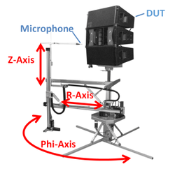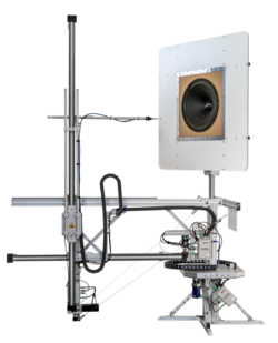 The Near-Field Scanner 3D uses a moving microphone to scan the sound pressure in the near field of a compact sound source such as a loudspeaker system or a transducer mounted in a baffle. The device under test (< 500 kg) does not move during the scanning process. The reflections in the non-anechoic environment are then consistent and can be monitored with our novel analysis software, which uses acoustical holography and field separation techniques to extract the direct sound and to reduce room reflections.