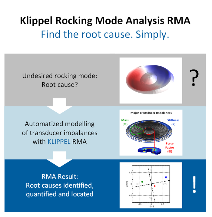 RMA identifies the root-causes for the rocking: Imbalances in the distributions of mass, stiffness and electromagnetic force factor. It quantifies their excitation forces, ranks them in order of magnitude and shows where the geometrical center for each of these imbalances is located on the diaphragm. With this information available, weak points in the design and in the manufacturing, process can be unveiled with great benefits for the performance and reliability of the speaker.