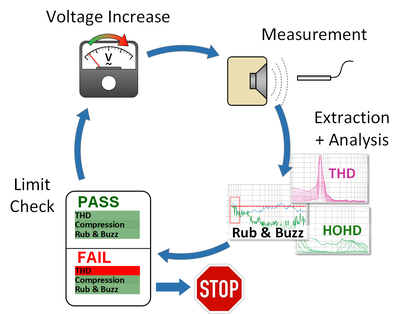 The TRF Voltage Stepping simplifies this measurement procedure. The module automatically increases the input voltage until a specific symptom is detected. This can be for example an Impulsive Distortion threshold (Rub & Buzz) or a certain level of the regular harmonic distortion to rate Umax and SPLmax according to IEC 60268-21.