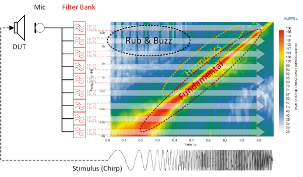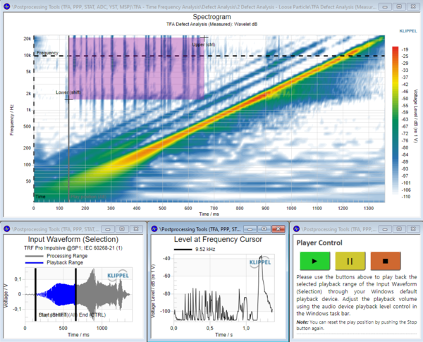 As a dedicated post-processing tool for the analysis of waveforms in time and frequency domain it can import any signal or impulse response generated by the KLIPPEL Analyzer System or imported from wave file. In addition to the spectrogram analysis options based on STFT, wavelet transform or auditory filter banks with superior time resolution, this powerful post-processing tool now provides an interactive band-pass filter and playback function for subjective distortion analysis and diagnostics. Replacing the PLAY module, the TFA can now load very long wave files in order to obtain signal characteristics and pick a time range for detailed analysis. Overall performance and usabil-ity and graphical appearance were improved.